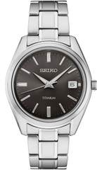 From the Essentials Collection. Offering classic dress/sport designs, the Essentials Collection provides the ideal solution for everyday wear. Crafted of durable and light-weight titanium, this perfectly tailored watch features a contemporary minimalist black sunray dial with date calendar, for a superb blend of clarity and wearability. The sapphire crystal adds superior scratch resistance. 10 bar, 100M Water Resistant
