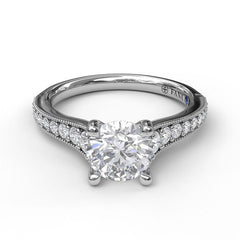 Delicate milgrain edges turns this classic engagement ring into something truly special. A classic band with milgrain detailing brings out old-world beauty and romance. This round cut engagement ring can be special ordered in any finger size, in Platinum, 18KT & 14KT gold and can be customized for any shape and size centerstone.