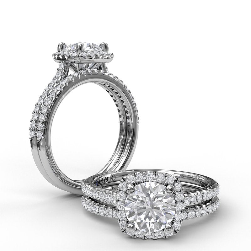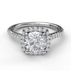The beauty of this piece is found in its dainty cushion halo, which makes this ring stand out with a fresh, lively feel. This delicate cushion halo with pave band engagement ring can be special ordered in any finger size, in Platinum, 18KT & 14KT gold and can be customized for any shape and size centerstone.