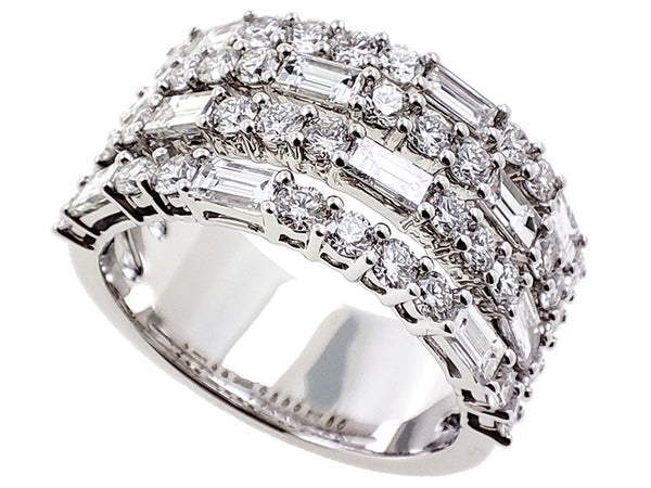 This Fashion Ring is available in 14K White Gold. There are a total of 50 stones. There are Baguette with a total carat weight of 1.18 set in a Prong Set setting.There are Rounds stones with a total carat weight of 1.27 set in a Prong Set.[/product_decription][unique_description_1]