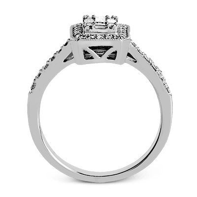 This engagement ring features a baguette diamond cluster at the center, framed by a halo of round diamonds. The diamond-accented band enhances its brilliance, giving the ring a glamorous and sophisticated appeal.