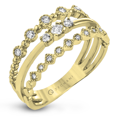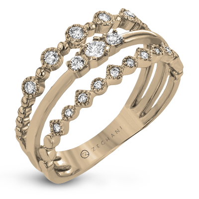 This ring features three connected rows, each adorned with round stones in alternating sizes for a dynamic look. The openwork design adds lightness and elegance while maximizing sparkle.