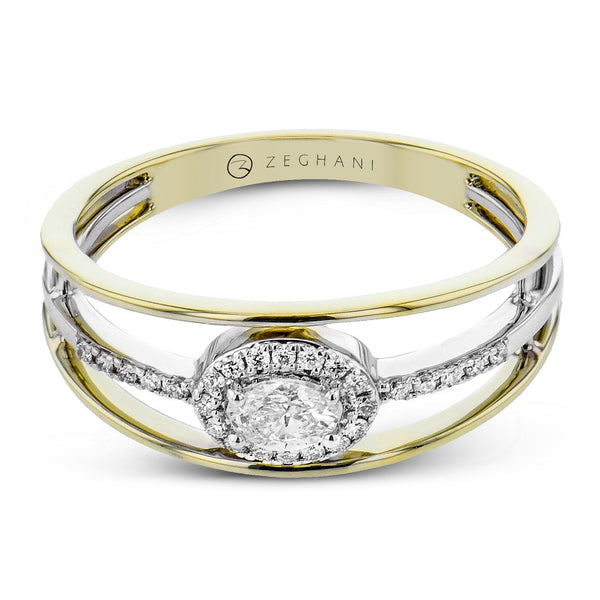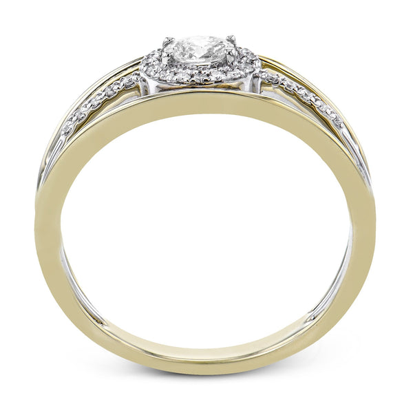 This ring showcases an oval-shaped center framed by a sparkling halo, set on a split band of white and yellow gold. The combination of two-tone metal and diamond accents gives it a refined and contemporary elegance.