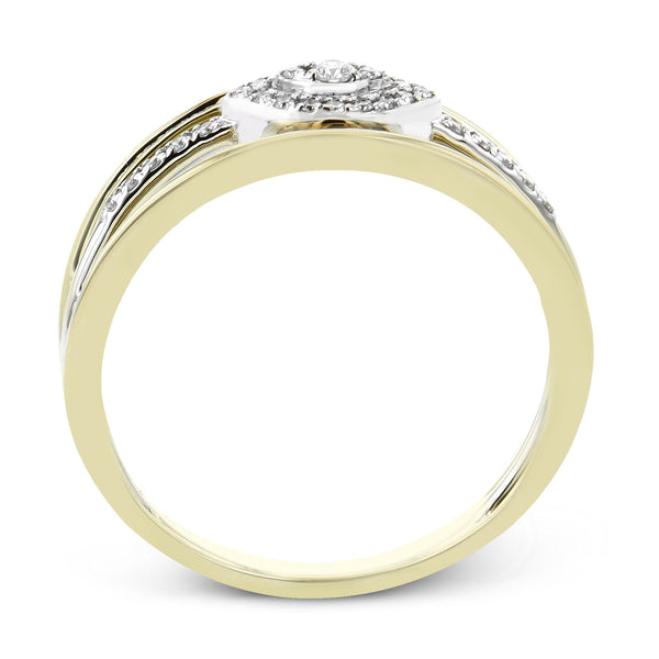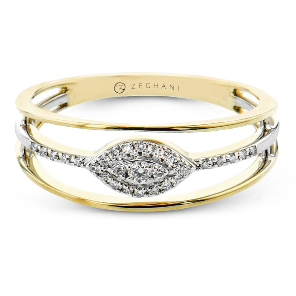This ring features a modern marquise-shaped diamond cluster framed by a unique double-band design in two-tone gold, blending elegance with contemporary style.