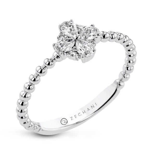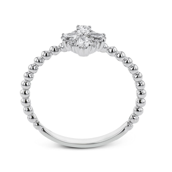 This charming ring features a delicate beaded white gold band topped with a floral cluster of marquise and round diamonds. Its feminine and whimsical design makes it perfect for stacking or wearing as a subtle statement piece.