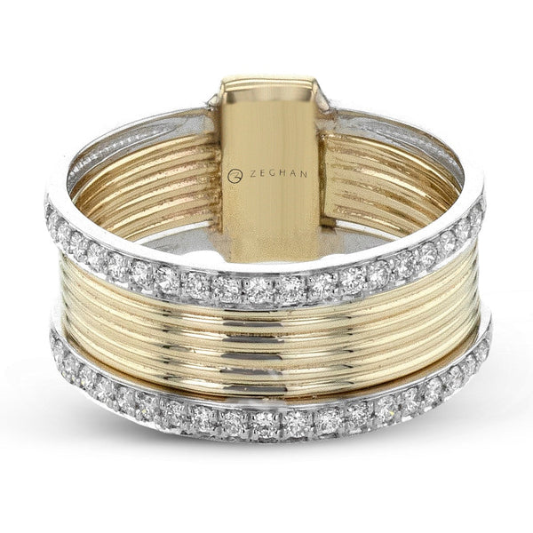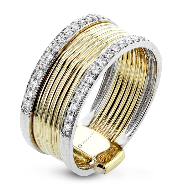 This bold ring features multiple rows of polished yellow gold wrapped in a ridged design, framed by two shimmering diamond-lined edges. Its wide-band style creates a striking balance of luxury and modern sophistication.