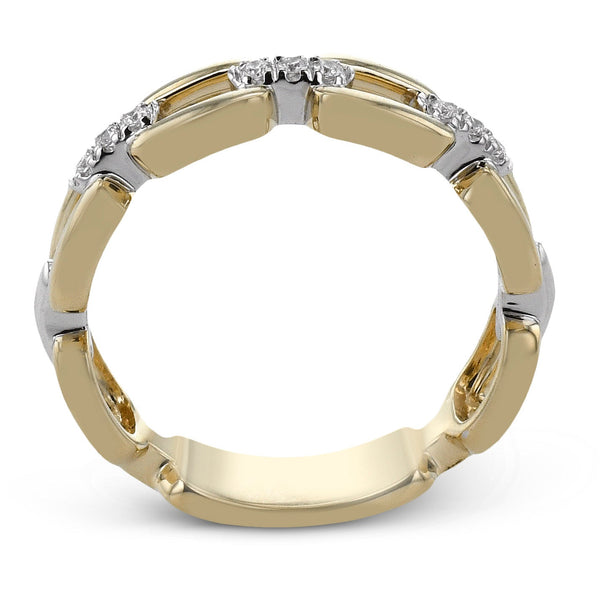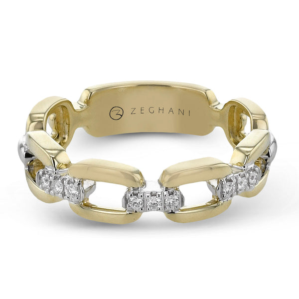 This bold ring features a contemporary chain-link design crafted in yellow gold, accented with white gold and clusters of sparkling diamonds. Its edgy, high-fashion aesthetic makes it a standout piece perfect for stacking or wearing solo.