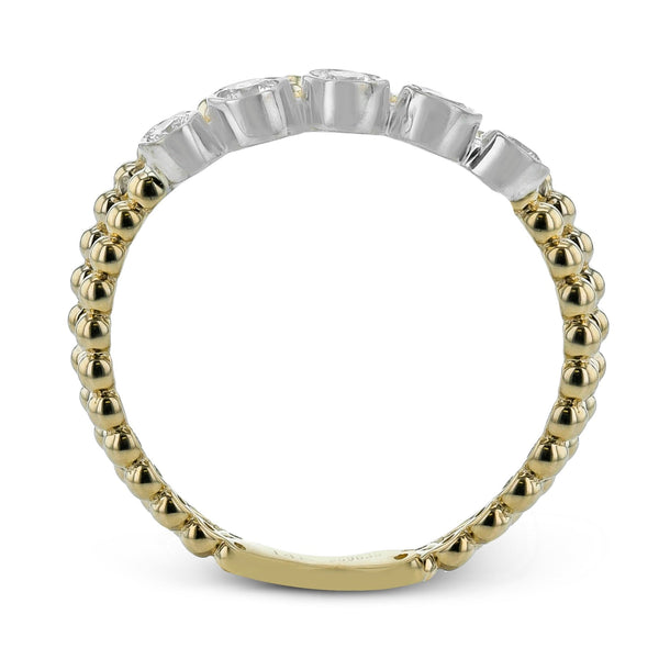 This stylish ring features two beaded yellow gold bands joined by a row of bezel-set round diamonds in white gold. The mix of textures and tones creates a modern, stacked look with effortless elegance.