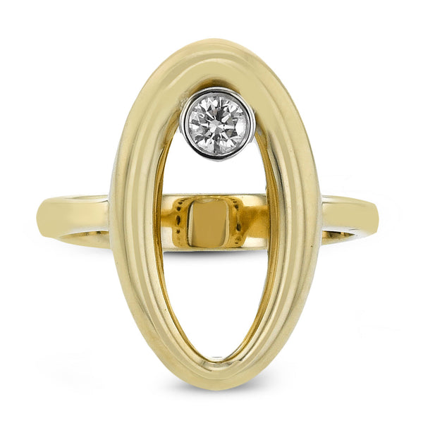 This modern open-shank ring features a bold, elongated oval design in yellow gold, framing a single bezel-set round diamond for a striking focal point. Its sculptural form blends artistry and elegance, perfect for a statement look.