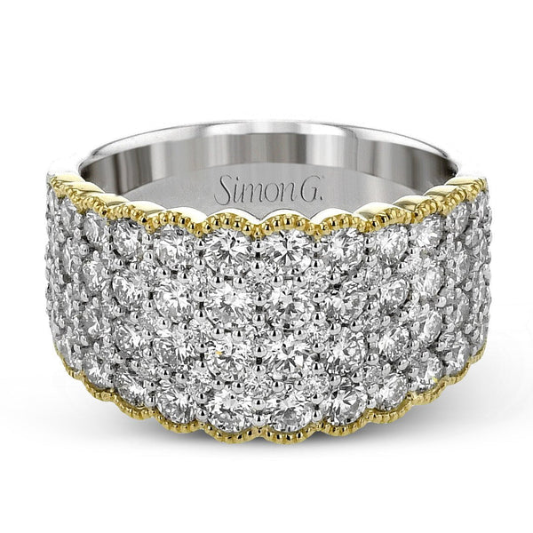 This statement ring features a bold design and yellow gold accentsas well as row after row of sparkling diamonds.