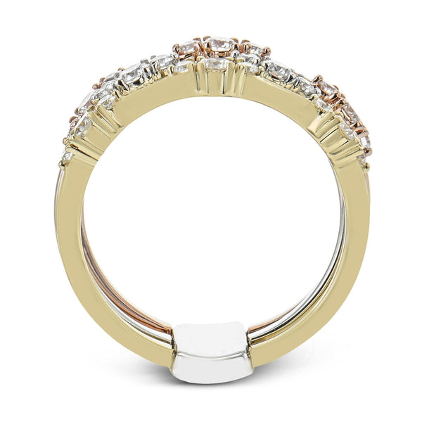 This distinctive diamondring is designed to look like three beautifully stacked ringsin 18k white, yellow and rose gold.