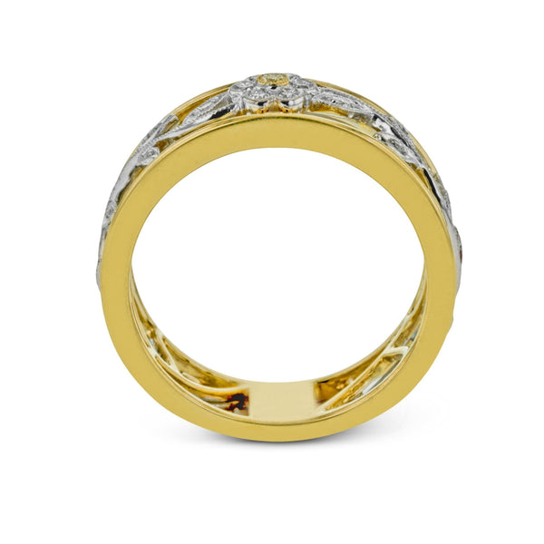 This eye-catching, vintage-style ring features an elegant floral design set with dazzling white and yellow diamonds.