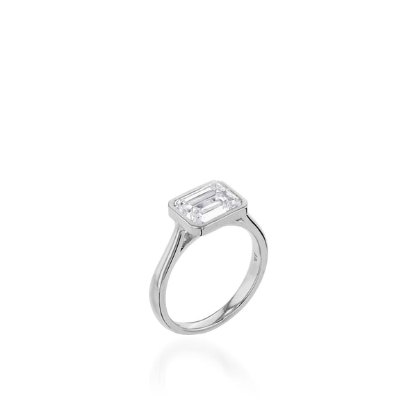 Ring shown in 18-karat Yellow Gold. Also available in White or Rose Gold and Platinum. Grace Bezel Set 2.00 Carat Emerald Cut Setting. Price shown. Setting can be made for any diamond size and shape. Contact a John Atencio representative. Ring Stock Size: 6