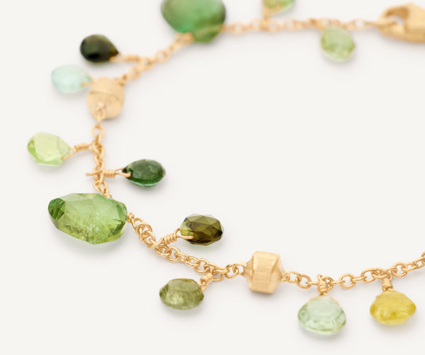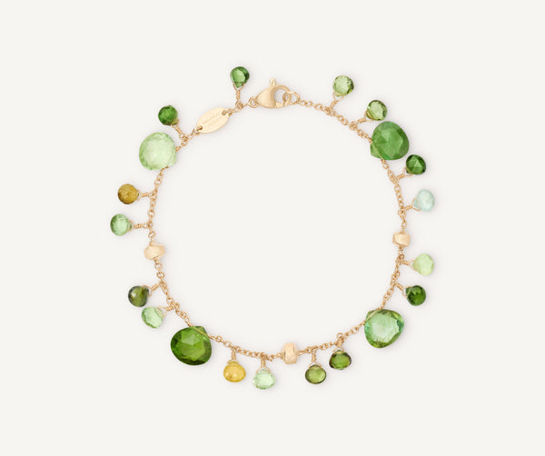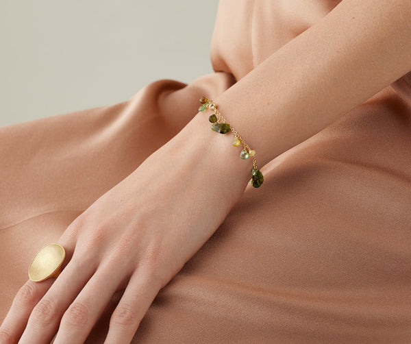A playful and charming show of the beautiful green tourmaline gemstone, this 18K gold bracelet is light and easy to wear. The 18K yellow gold nuggets are finely hand-engraved using the ancient Florentine technique and alternate with carefully selected heart-cut green tourmalines.