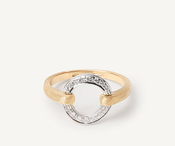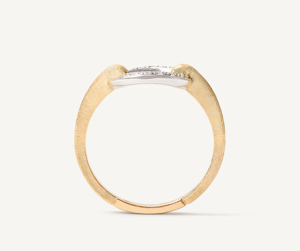 This sophisticated ring features a link in 18K white gold with an irregular surface embellished by a selection of small brilliant-cut diamonds. The shank is finely hand-engraved using the ancient Florentine technique which gives our gold a fine, brushed texture.