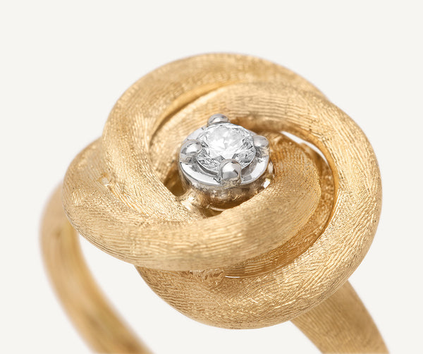 18K yellow gold floral shape bands, finely hand-engraved using the ancient Florentine technique, envelop a precious brilliant-cut diamond. A romantic ring with a design inspired by nature, a delicate balance of shapes and volumes.