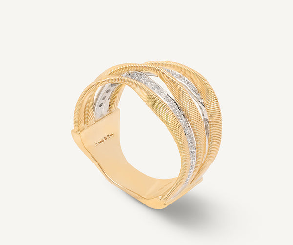 The refined design of this 18kt yellow gold ring makes it a precious accessory to wear every day. Three strands of twisted coil alternate with two brilliant-cut diamond pav bands, creating a mesmerizing combination of textures and colors.