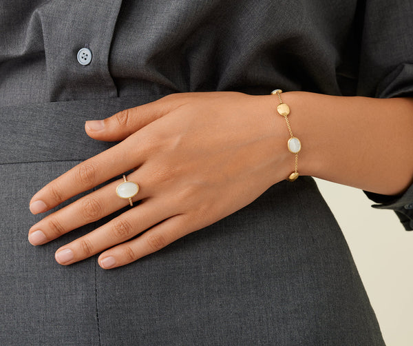 This delicate ring features a central mother-of-pearl set in a 18kt yellow gold bezel finely hand-engraved 18kt using the ancient Florentine technique. The band is adorned with a selection of small brilliant-cut diamonds.
