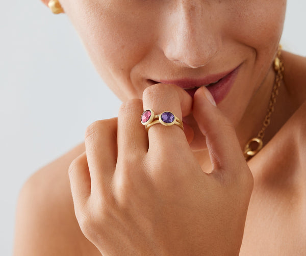 Ring in 18kt yellow gold hand-engraved with the ancient Florentine technique and embellished with a rose-cut amethyst. Elegant on its own, it is the perfect addition to a stackable look.