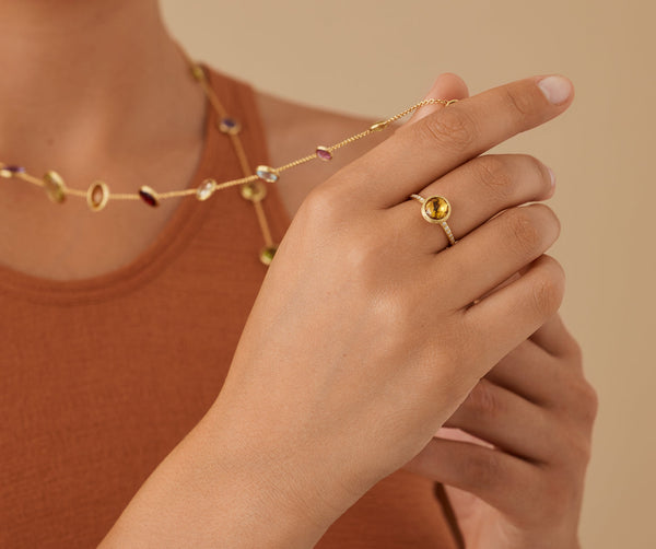 Ring in 18kt yellow gold hand-engraved with the ancient Florentine technique and embellished with a rose-cut citrine quartz and a sequence of small brilliant-cut diamonds. Elegant on its own, it is the perfect addition to a stackable look.