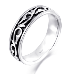 This men's wedding band features a distinctive design with an undulating strand of black diamonds along its center.