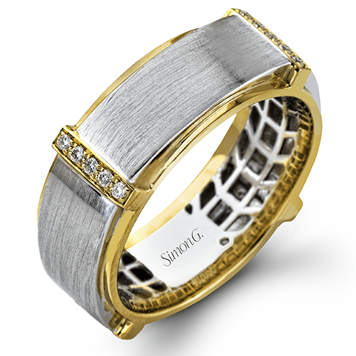 This classic men's band design features a brushed metal finish with a high-polished gold stripe through the middle.