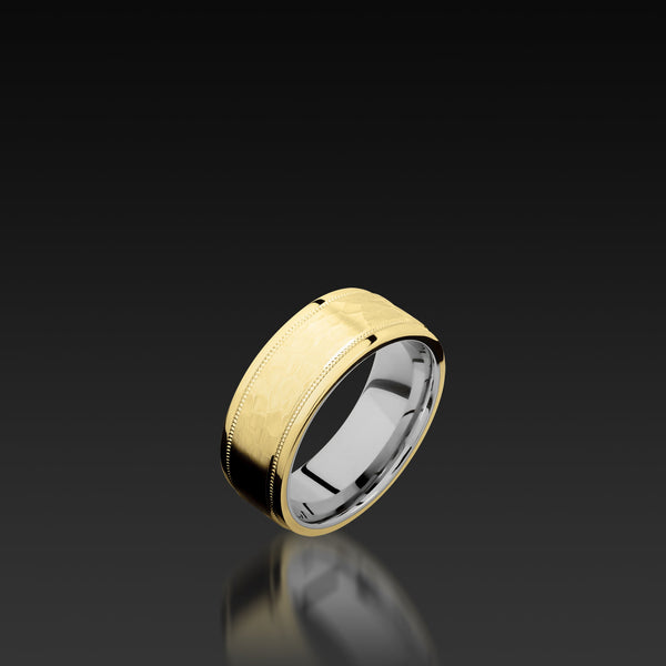 • 14 karat Yellow Gold wide flat stepped edge milgrain band with hammer and polish finish
