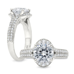 A double row of diamonds forms a beautiful oval shape halo for your round stone. Diamonds flow down the shank.