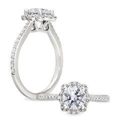 Delicate halo, pinch shank with diamonds. Elegant and modern.