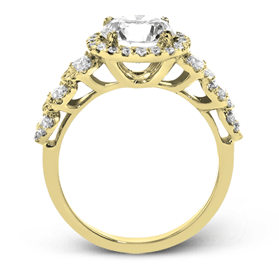This engagement ring features a stunning round center diamond surrounded by a glittering halo, with a split shank design accented by additional diamonds. Its intricate setting delivers brilliance from every angle, blending vintage elegance with bold sparkle.