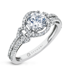 This ring features a dazzling halo design with a split-shank band lined with sparkling stones. Intricate side detailing adds extra brilliance and elegance to its timeless silhouette.