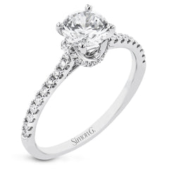 This timeless engagement ring features a hidden halo for added sparkle and dimension. Pavé-set diamonds along the slender white gold band create a refined, elegant silhouette perfect for a classic yet modern bride.