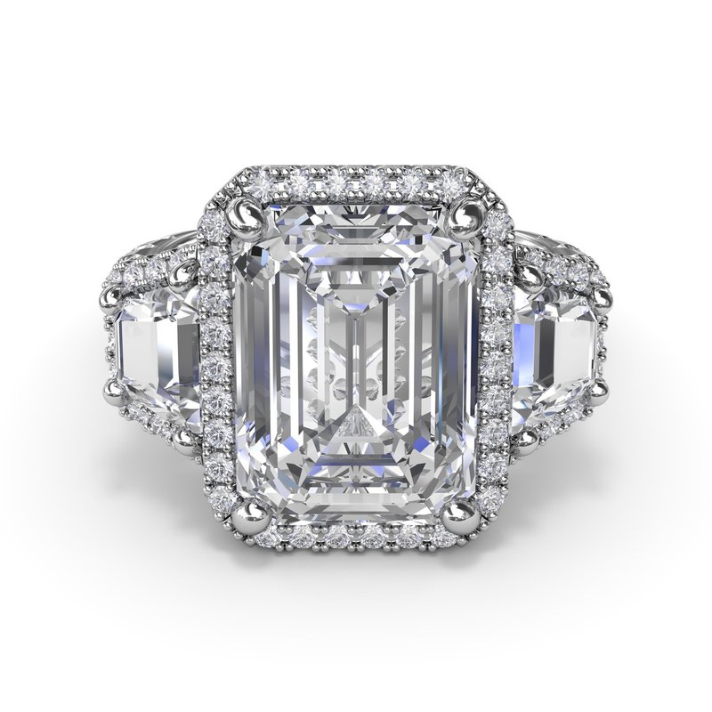 With modern details this ring features two trapezoid diamonds that are surrounded by a custom shaped halo of round brilliant cut diamonds and claw style prongs. The tapered shank features graduated diamonds to complete the ring. This engagement ring can be special ordered in any finger size, in Platinum, 18KT & 14KT gold and can be customized for any shape and size centerstone.