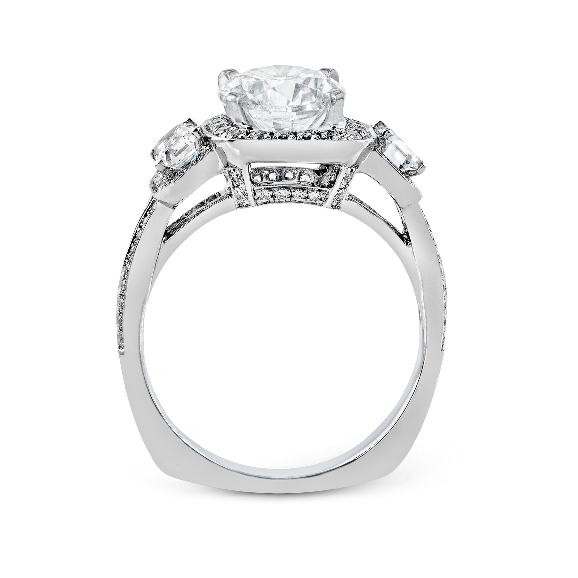 This impressive engagement ring features a halo design along with brilliant emerald side diamonds and sparkling round diamonds.