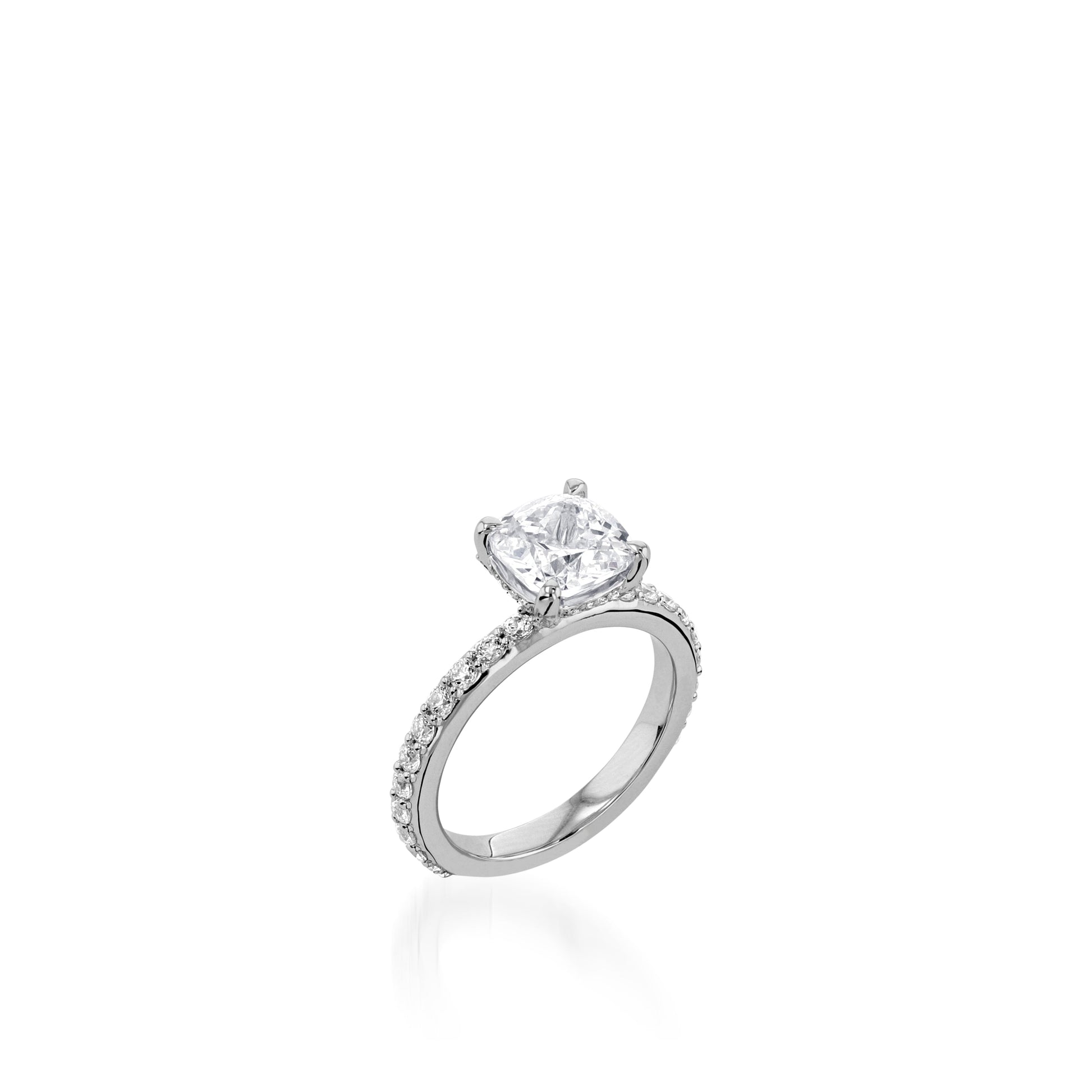 This elegant ring is crafted in 18-karat White Gold and is also available in Yellow, Rose Gold, and Platinum. It features pavé diamonds with a total weight of 0.65 carats and comes in stock size 6.5.