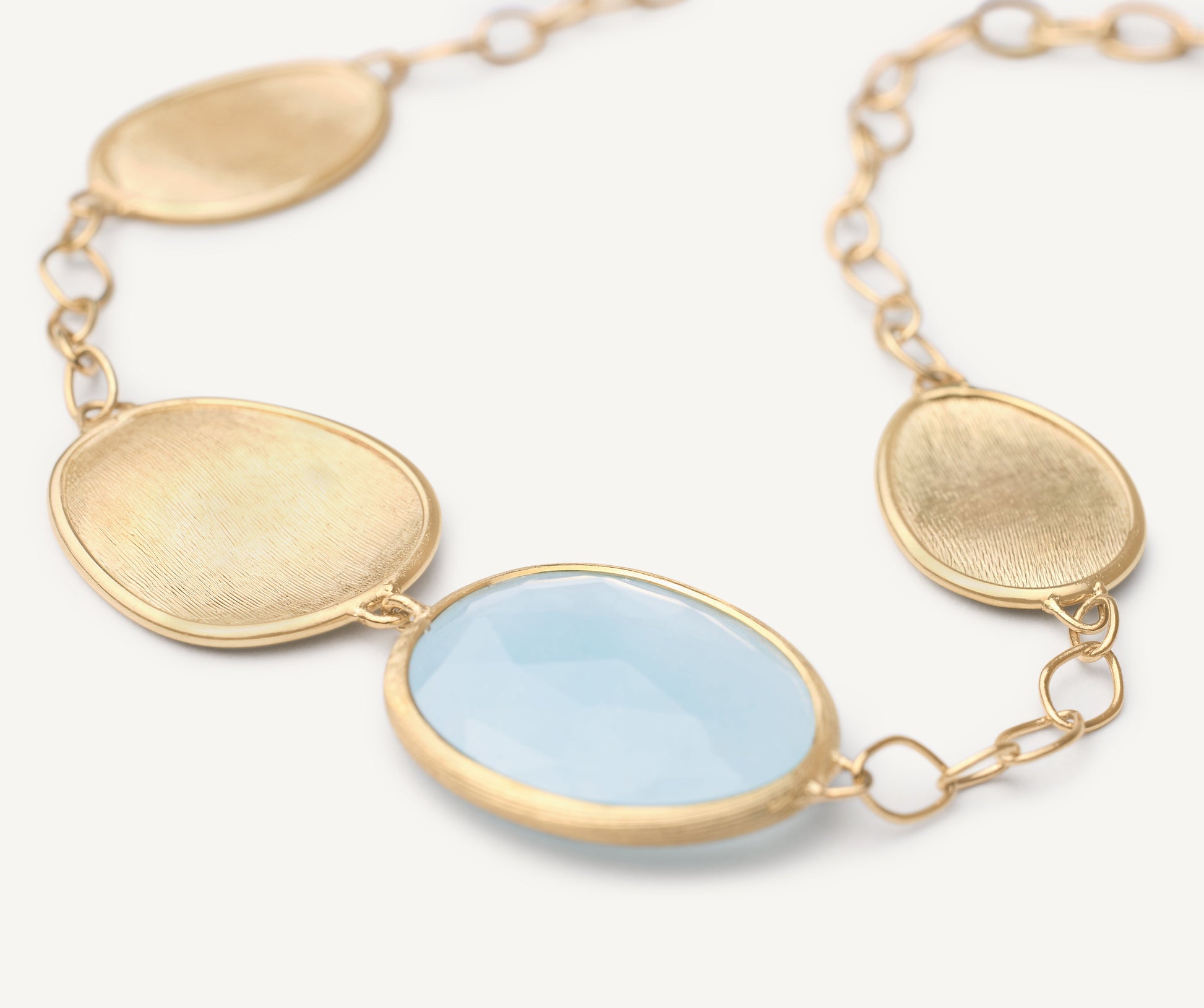 Delicate and chic, this 18k yellow gold bracelet combines light gold leaves with a natural leaf-shaped aquamarine stone, for a touch of colour. Perfect for everyday wear, it is finely hand-engraved using the ancient Florentine technique. Adjustable chain.