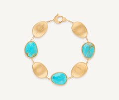 Vibrant in color, this bracelet features a beautiful alternation of light 18K yellow gold leaves and turquoise. The gold leaves are delicately hand-engraved using the ancient Florentine technique, interspersed with a sleek chain. The perfect accessory to complete any look with a touch of color.