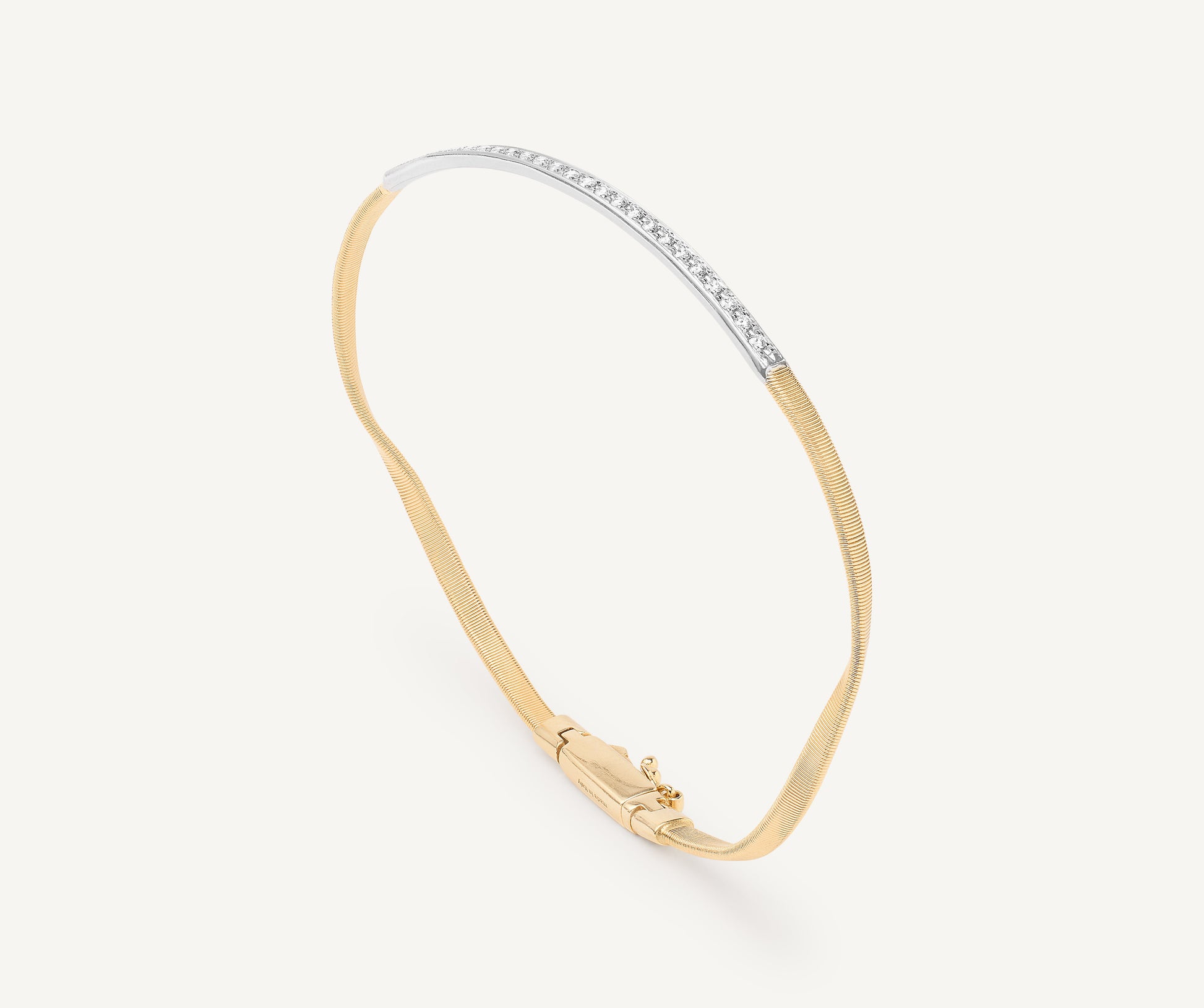 A single 18kt yellow gold spiral strand, carefully created with the exclusive coil technique and embellished with a diamond bar. Perfect on its own, stunning paired with the other bracelets in the collection.