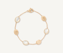 Elegant and timeless, this 18kt yellow gold bracelet alternates thin chain links with oval elements with an irregular surface, finely hand-engraved using the ancient Florentine technique, and carefully selected white mother-of-pearls.