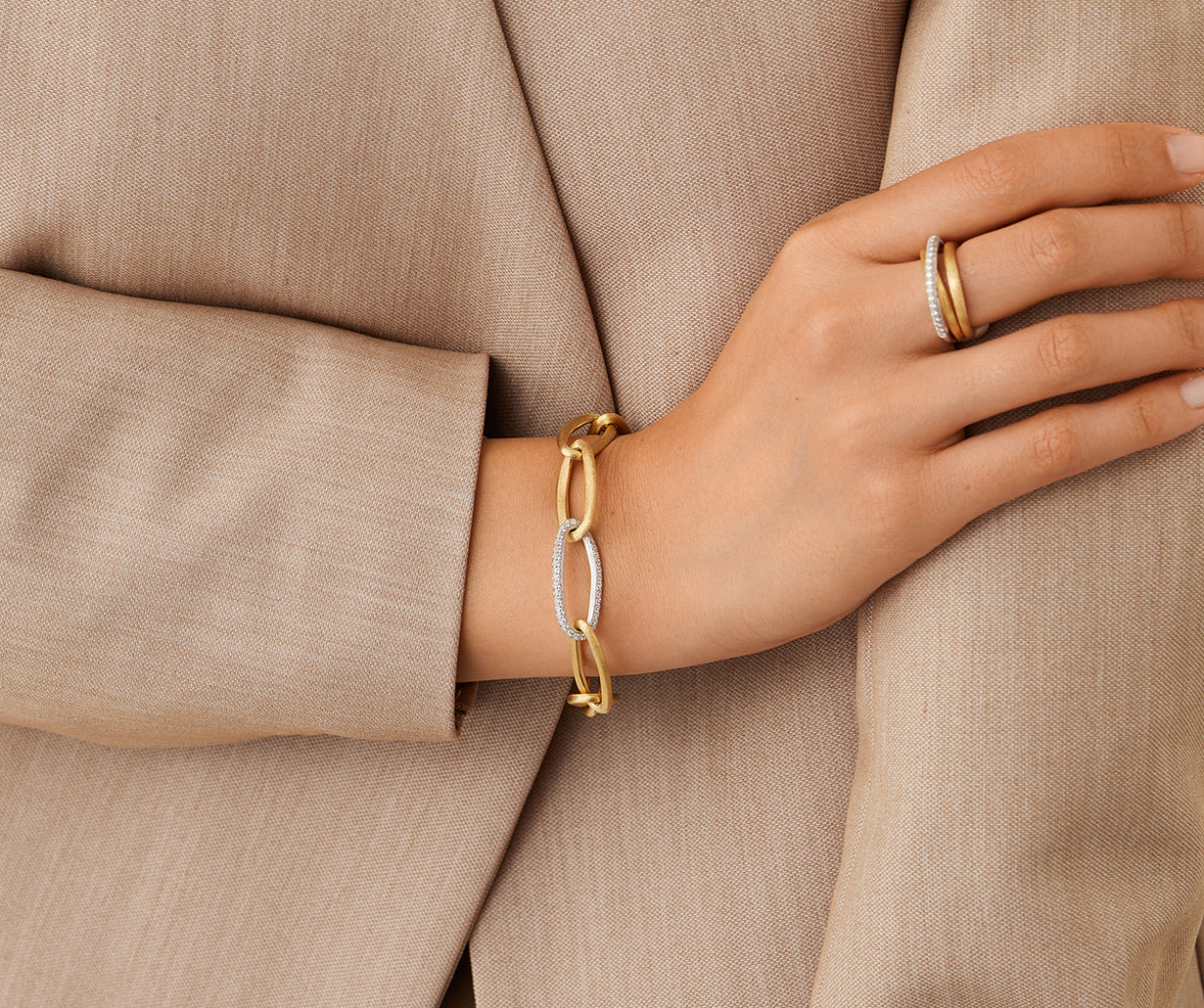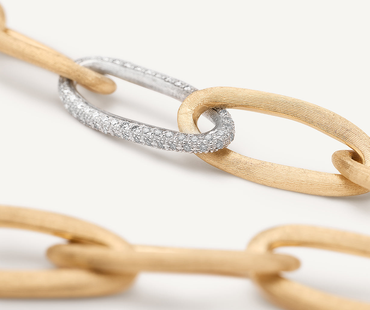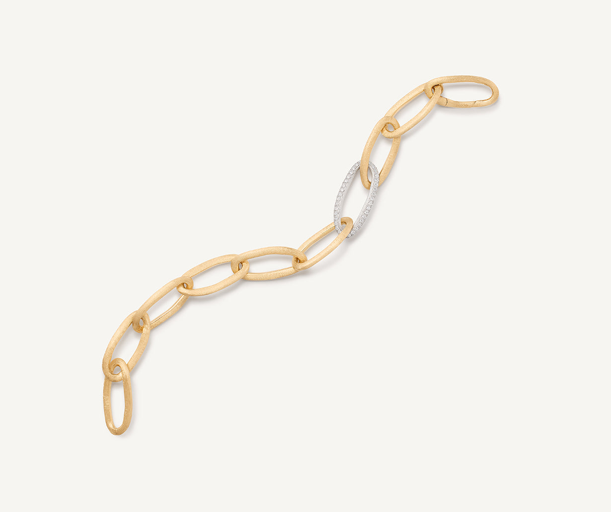A stunning elongated link bracelet made up of oval elements in 18kt yellow gold, finely hand-engraved using the ancient Florentine technique which gives our gold a fine, brushed texture. The bracelet is further embellished with a brilliant-cut diamond pav�� link carefully hand set in a honeycomb pattern to achieve maximum shine.