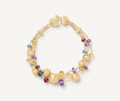 A three-strand bracelet that features a bold mix of colored gemstones, carefully selected for intensity and purity, and 18kt yellow gold beads, finely hand-engraved with the ancient Florentine technique. Fun and lively, this bracelet is perfect to complete the look and adds a touch of color to any outfit.