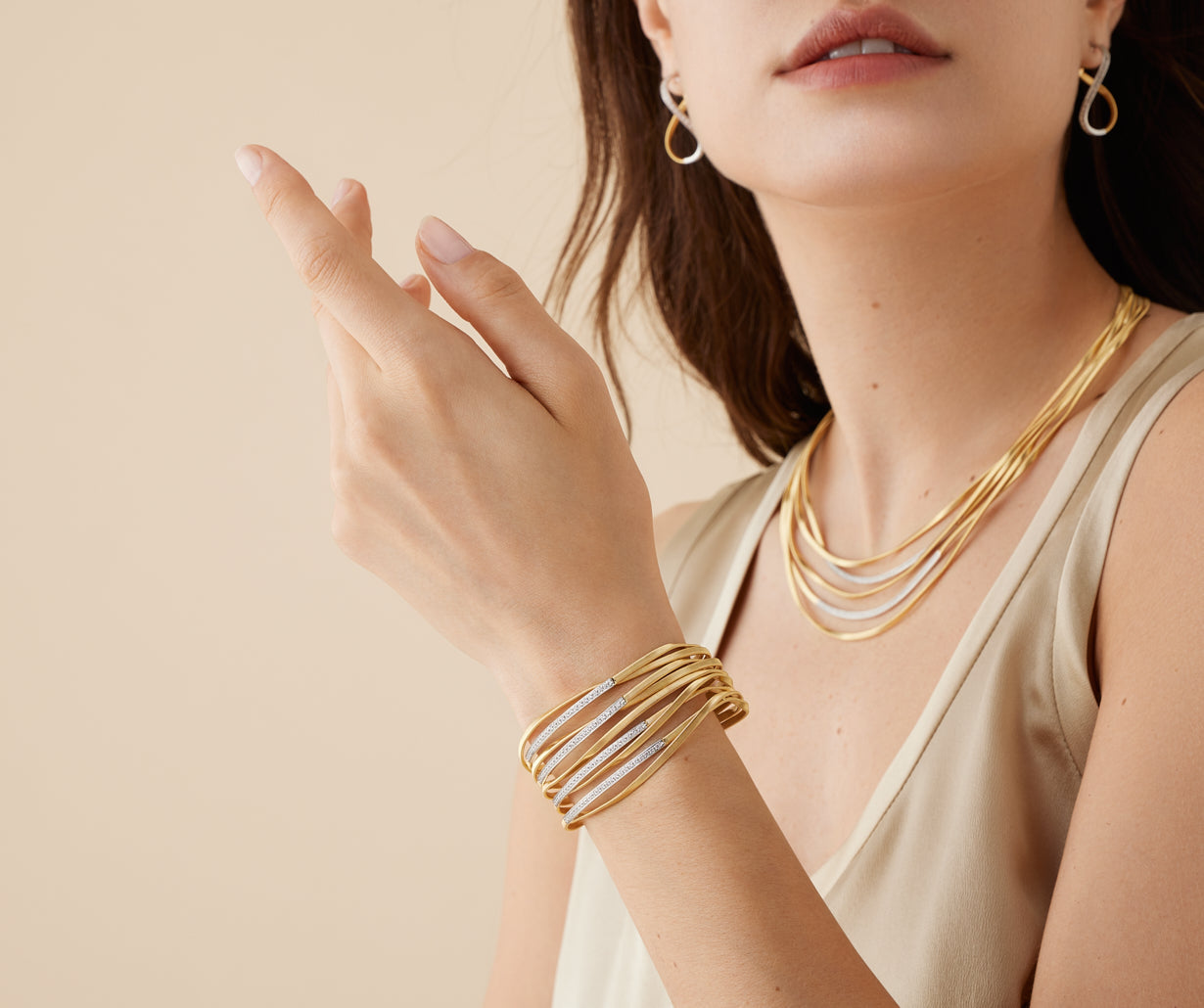 An elegant nine-strand twisted coil bracelet in 18kt yellow gold, carefully created with the exclusive coil technique and embellished with four diamond bars. Perfect on its own, stunning paired with the other bracelets in the collection.