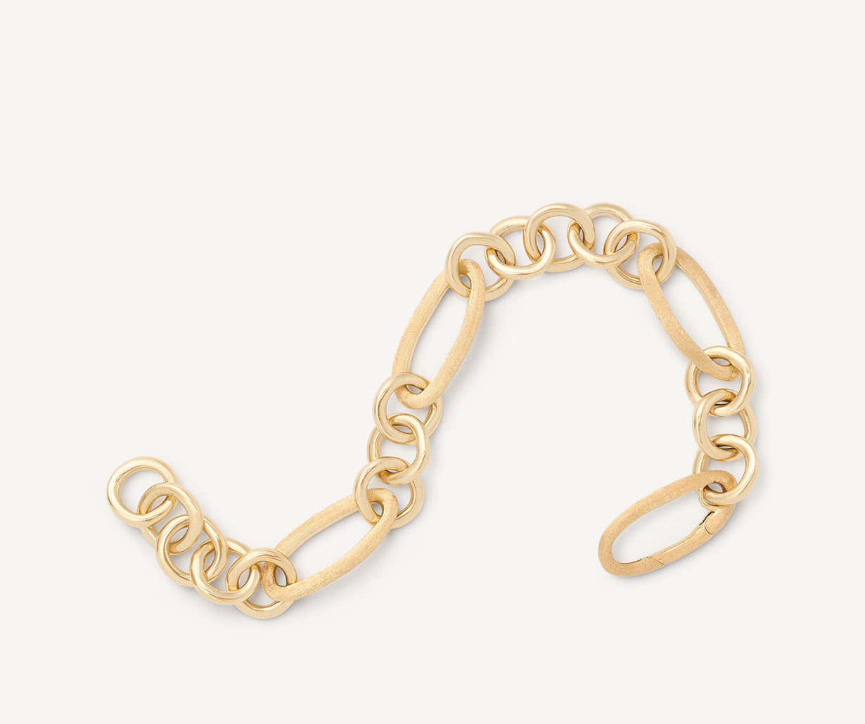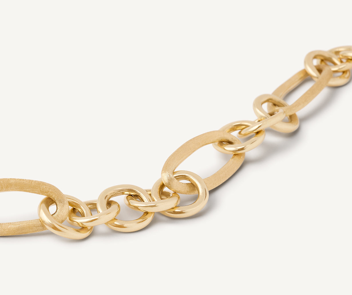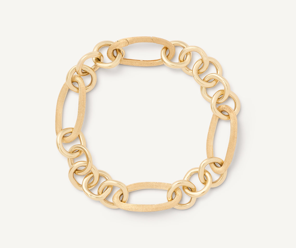 This chain bracelet is made up of oval elements in 18kt yellow gold, finely hand-engraved using the ancient Florentine technique, alternated with circular elements in polished gold. The interplay of polished and engraved finishes gives the piece a brilliant yet discreet quality: a new chain model with a strong character.