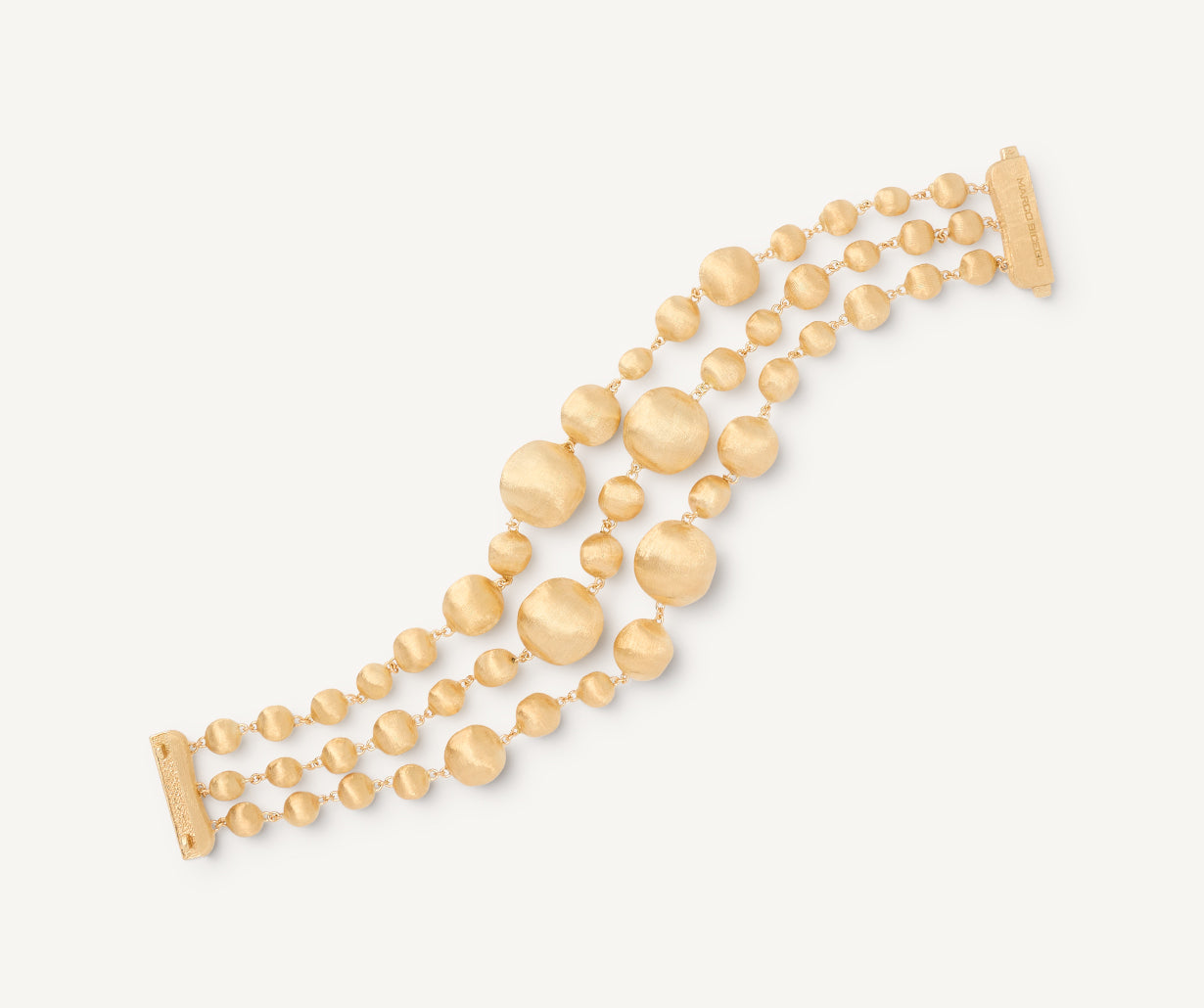 This sophisticated 18kt yellow gold bracelet features a three-strand design with mixed beads of different sizes. Its irregular surface is finely hand-engraved with an ancient Florentine technique which gives our gold a fine, brushed texture.