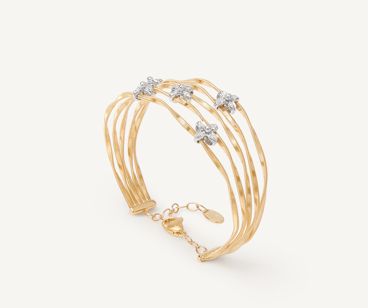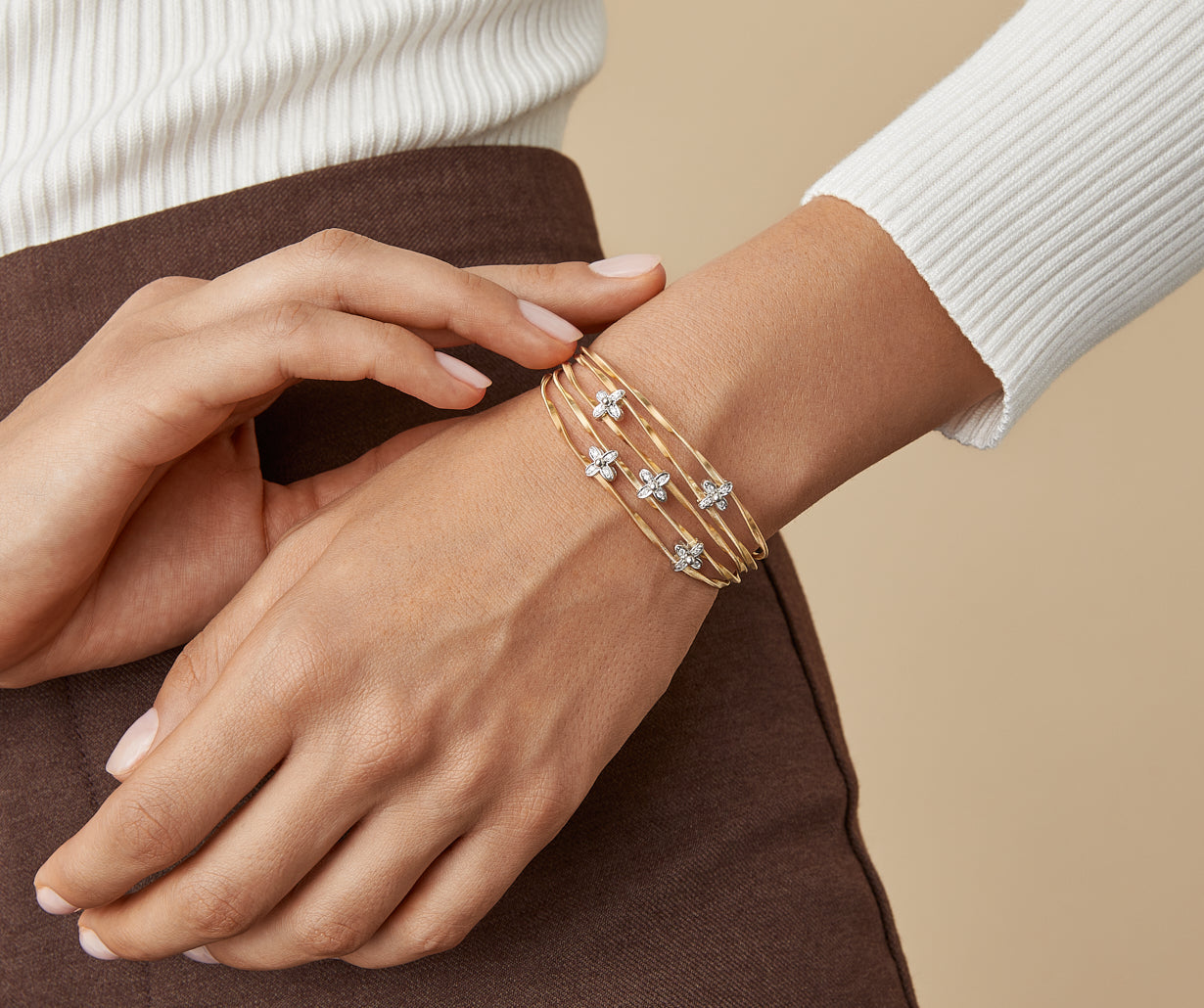 Sophisticated and perfect to embellish any look, this bangle is a gem of timeless design. Floral diamond pav��s dot the iconic 18kt yellow gold spiral strands, created with the artisanal coil technique, making this jewel even more refined.