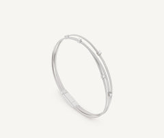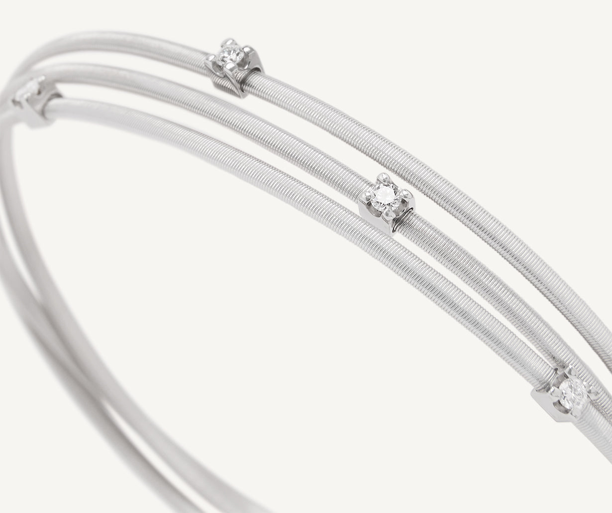 Three strands of flat spiral threads, carefully created with the exclusive coil technique, meet in a play of extraordinary brilliance in this 18kt white gold bracelet featuring five brilliant-cut diamonds.