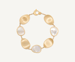 In this sophisticated bracelet a lightweight chain combines 18kt yellow gold leaves, finely hand-engraved using the ancient Florentine technique, with delicate petals of uniquely cut white mother-of-pearl. A classy piece of jewelry to great effect.