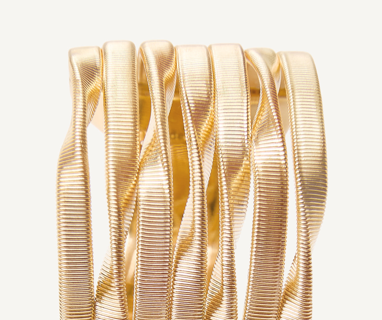 A true prt-a-porter icon, this stylish 18kt yellow gold ring, boasting striking volumes and unique wearability, is crafted from seven spiral threads carefully created with the exclusive coil technique.