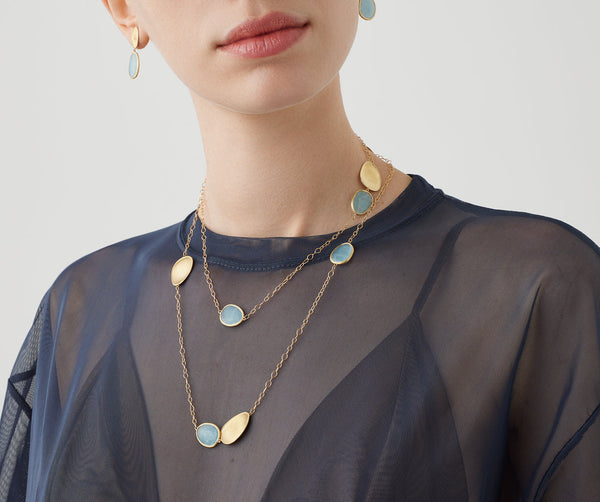 In this long necklace, heart-cut milky aquamarines are interspersed with small 18K yellow gold nuggets, finely hand-engraved using the ancient Florentine technique. Perfect even when doubled, it exudes a certain ���je-ne-sais-quoi��� that speaks of lightness, energy, and joy of living.