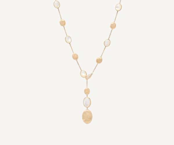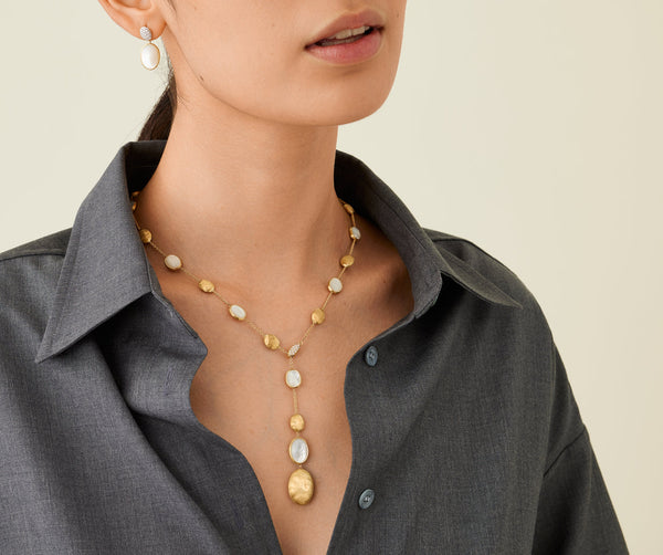 With a fresh and sophisticated look, this lariat alternates carefully selected white mother-of-pearls with 18kt yellow gold oval elements, finely hand-engraved using the ancient Florentine technique, creating an extraordinary effect of brilliance and silky texture. The diamond pav�� clasp provides the perfect fit and endless possibilities for any neckline, outfit, or occasion.